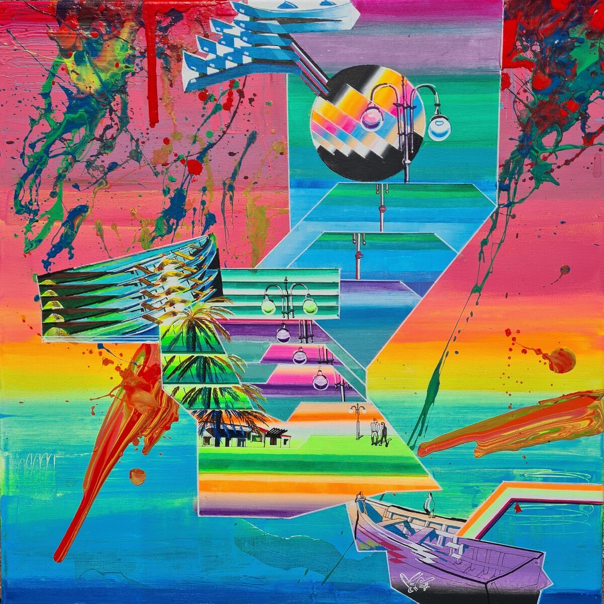 Colorful painting inspired by vaporwave art and glitch art. Tropical motive with vibrant, dynamic paint application. Explore all fascinating details - boats, houses, palm trees, and amazing colorful gradients and textures. This summer painting spreads a happy vibe, and will immediately brighten up your home or office. Used neon paints are glowing luminescent colors and glow under blue lights.
