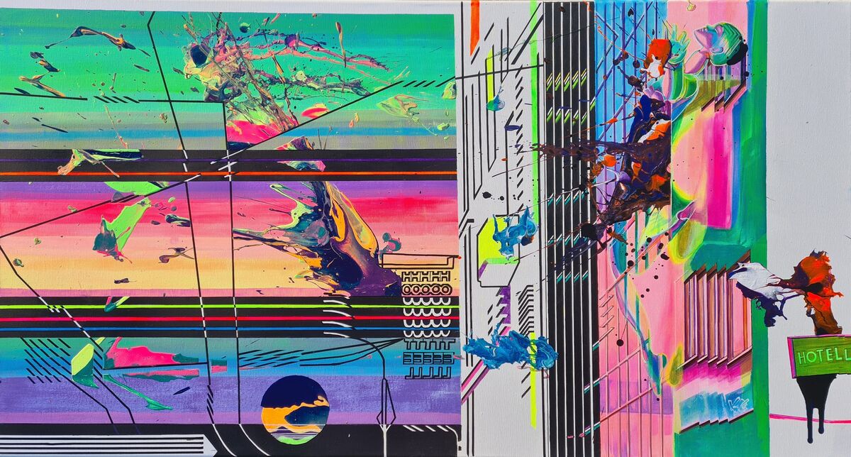 Are you looking for original pop of color painting to brighten up your space? This vaporwave and glitch art-inspired artwork with intriguing perspective, dynamic composition, and eye-catching details will inspire you! The color palette is very bright and optimistic, used neon paints give a tropical vibe. This architecture art is an exceptional decor for modern interiors. Used neon paints are glowing luminescent colors and glow under blue led lights.
