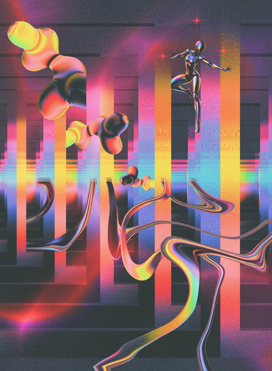 Funky mix of graffiti and digital dreamscape, with voxel art character