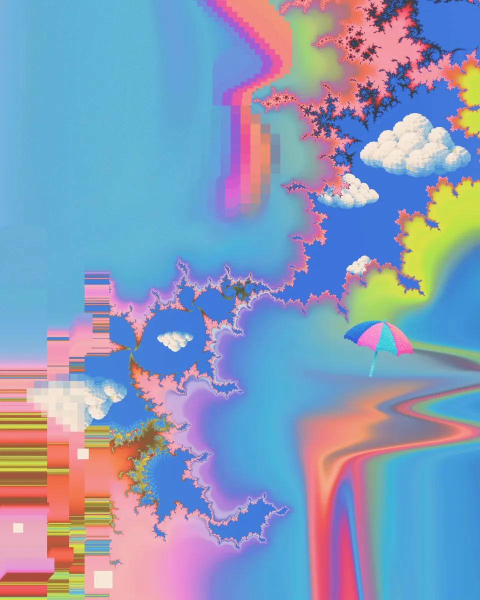 A vacation that exists somewhere between math and memory. “Vacation in Mandelbrot” is a vaporwave beach wall art poster that transforms fractal geometry into a surreal escape. Soft gradients, floating clouds, and a tiny umbrella invite you into a place that feels both digital and strangely familiar. This frutiger aero aesthetic decor piece blends pastel tones with organic fractal edges, creating a dreamy surreal landscape print that feels calm, playful, and immersive at once. The gentle palette leans into a soothing pastel dreamcore art atmosphere, while subtle distortions introduce a refined glitch abstract wall decor edge. The umbrella detail turns abstraction into narrative — a quiet moment of rest inside an infinite world. Perfect for: • bedrooms & cozy aesthetic spaces • summer-inspired interiors • creative studios & workspaces • gifts for art lovers & dreamers