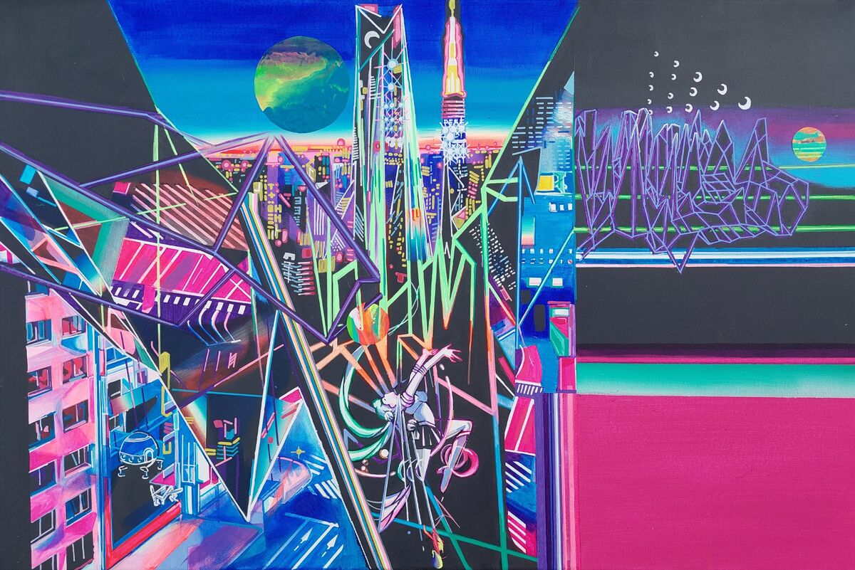 Retrofuturistic painting inspired by Tokyo, anime and 90s aesthetics.