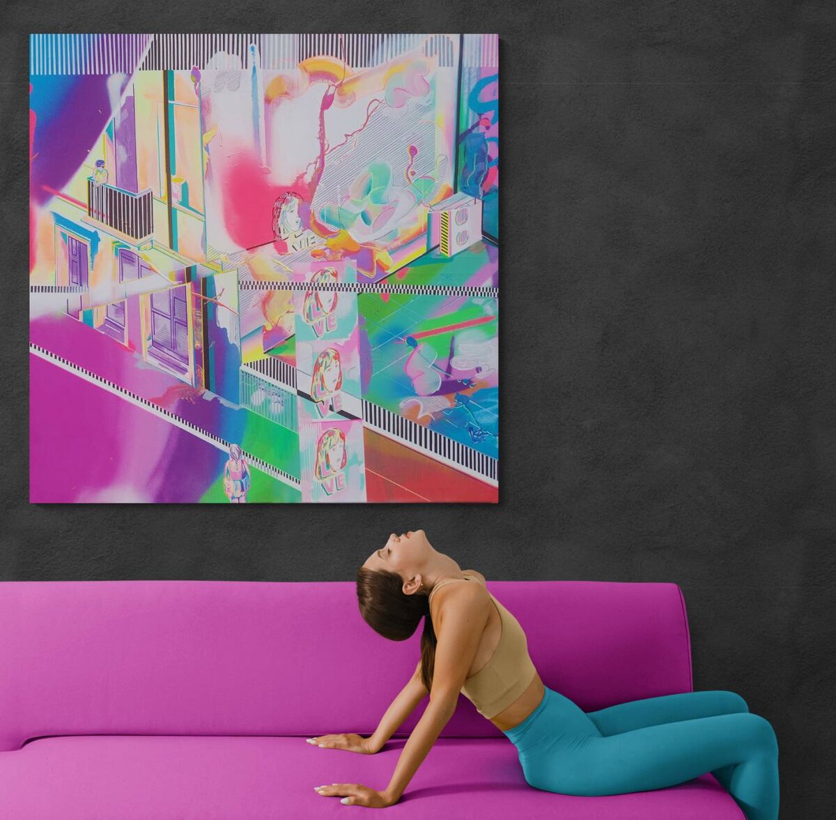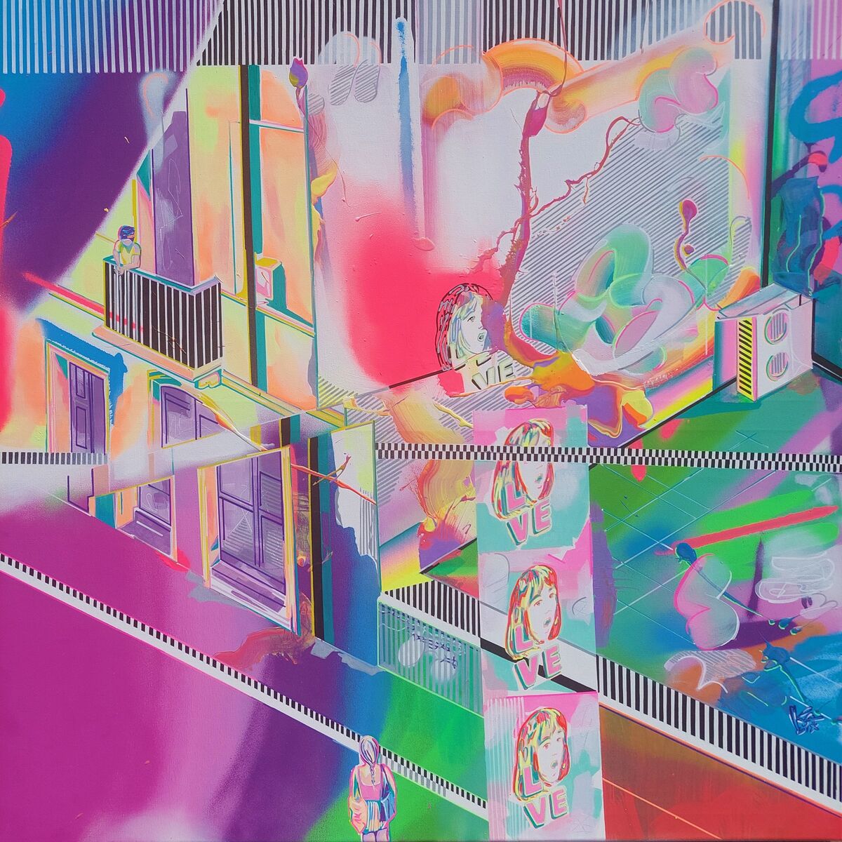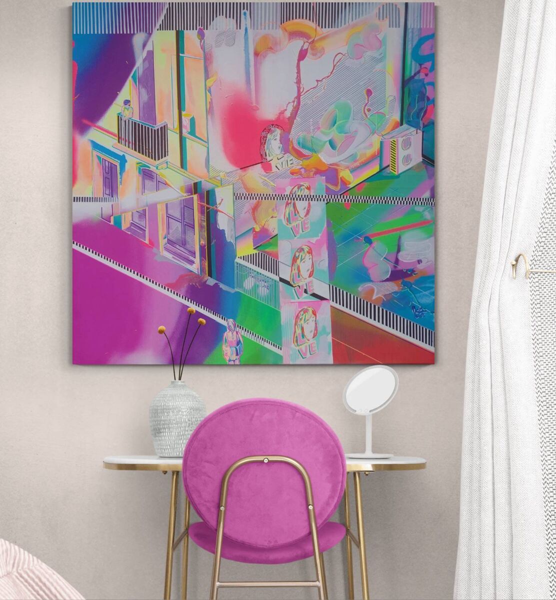 Pop art painting with storytelling retro LOVE motive. Playful, expressive, and inspiring large street art full of striking details, dynamic motion of colors, and captivating composition. Moreover, used neon paints are glowing luminescent colors and glow under blue light! This acrylic painting is a perfect choice for modern space.