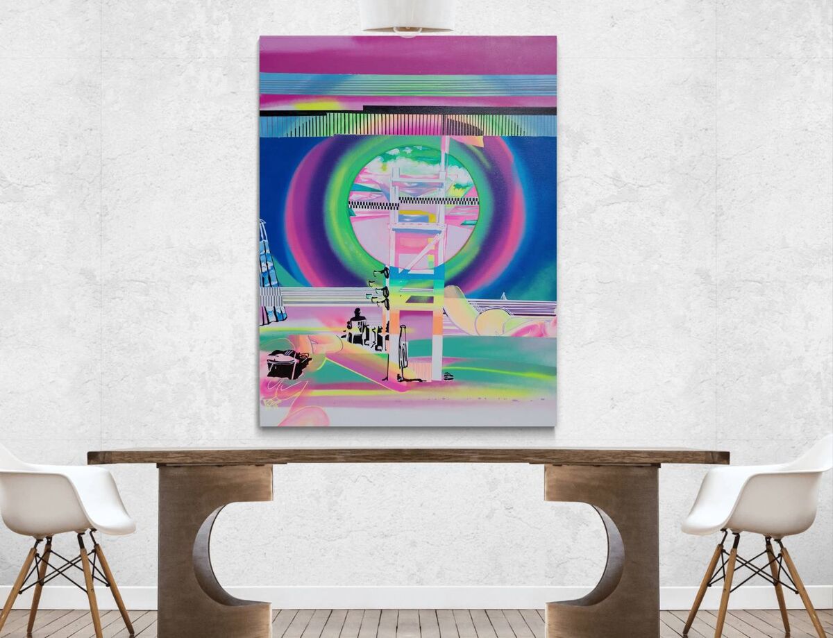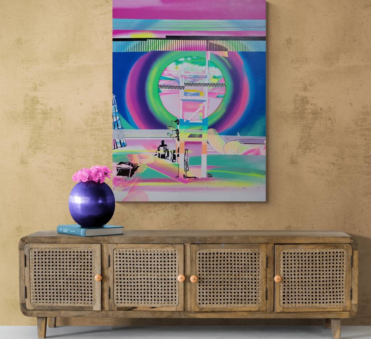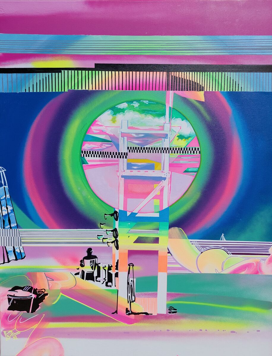 This lifeguard tower painting, with playful glitches and inspiring composition, will take you to the summer of your dreams! Bold and vibrant color palette with a pop of neon colors, eye-catching hand-drawn details of lifeguard sitting under the tower and watching the sea. Good vibe tropical wall art for sea lovers! Used neon paints glow in blue light.