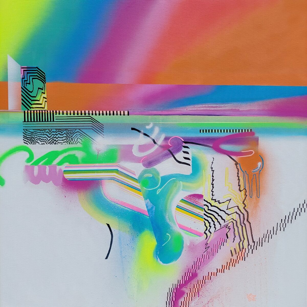 A large abstract acrylic painting on canvas done in a modern, street-art style and glitch aesthetics. This vibrant contemporary artwork full of motion, created with spray-paints, acrylic paints, and detailed markers, will provide a pleasant, inspirational, and good feeling to your home. Title of painting: EXIT Dominant colors: orange, pink, blue, white Accent colors: neon green, purple, black Dimensions: Height: 100 cm / 39.3701 in; Width: 100 cm / 39.3701 in The thickness of the frame: 1 cm / 0.39 in. NOTE: - this is the thickness of the wooden frame on which is canvas stretched, sides are painted, and ready to hang. Format: Square