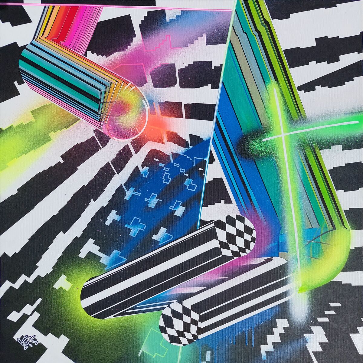 Are you looking for a contemporary abstract wall art, inspired by science? Made with spraypaints, acrylic paints, and detailing markers, this checkered and illusion art, full of motion, will bring a positive, inspiring, and good vibe to your living room or bedroom. Used neon paints glow in blue light.