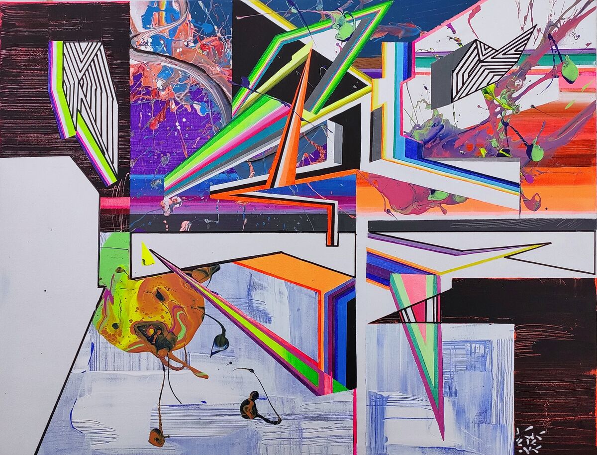 Are you looking for modern and colorful wall decor? This large geometric painting with striking shapes and bold colors fills the room with energy and good vibes! Explore all playful and precise details of this one of a kind artwork! Used neon paints are glowing luminescent colors and glow under blue led lights.
