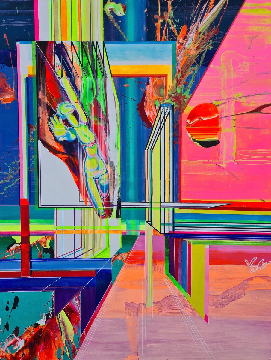 Are you a fan of cyberpunk art? This large colorful painting with dynamic composition and vibrant colors fills the room with energy and good vibes! Explore all playful and precise details of this one-of-a-kind artwork! Used neon paints are glowing luminescent colors and glow under blue lights.