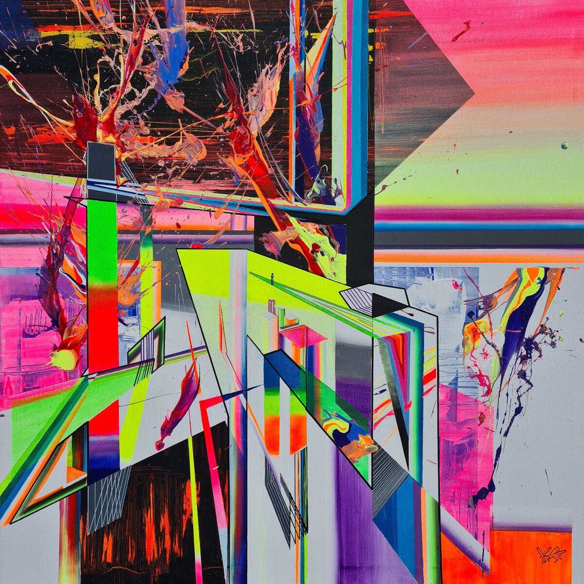 Are you a fan of cyberpunk art? This large colorful painting with dynamic composition and vibrant colors fills the room with energy and good vibes! Explore all playful and precise details of this one-of-a-kind artwork! Used neon paints are glowing luminescent colors and glow under blue lights.