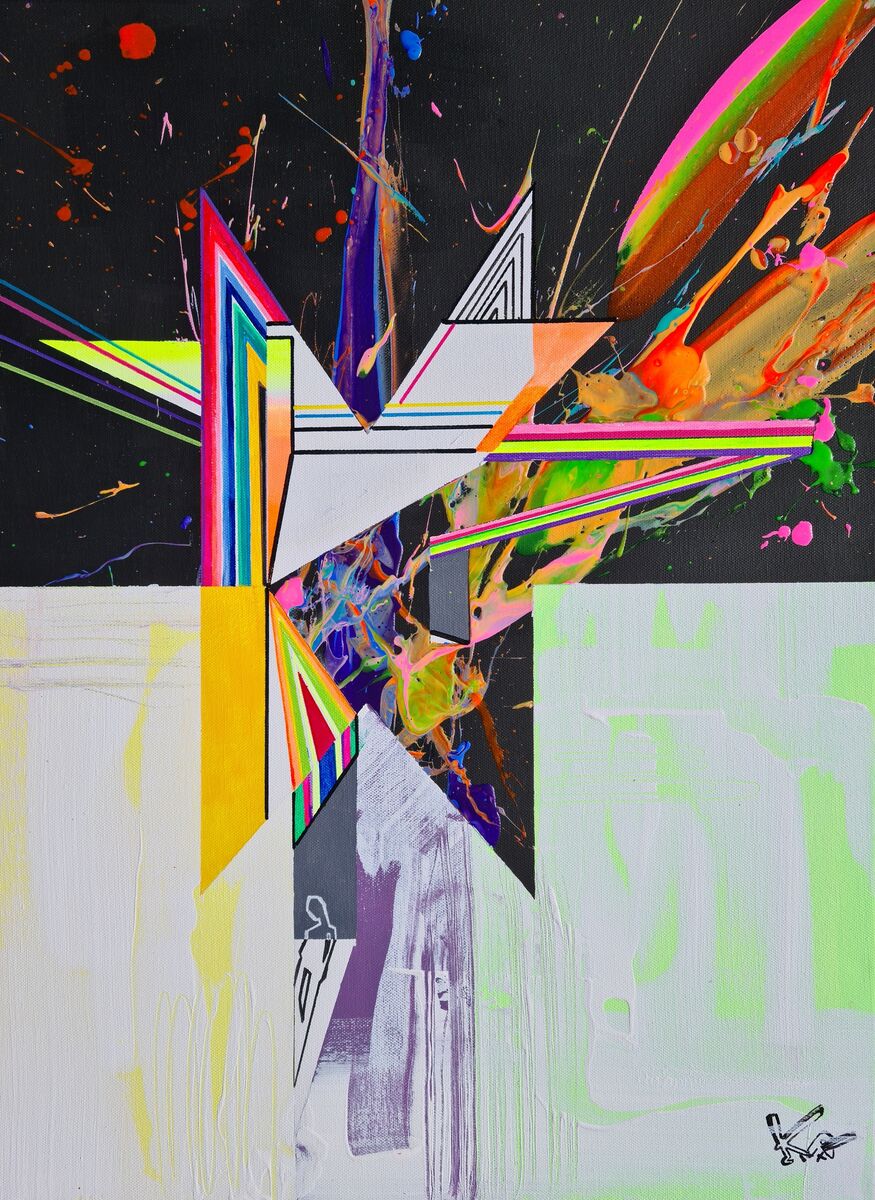Enjoy bold style, colors, and architecture? This inspiring geometric acrylic painting is a great choice for you! Explore all playful and precise details of this one-of-a-kind artwork! Architectural art for modern and stylish interiors! Used neon paints are glowing luminescent colors and glow under blue led lights.